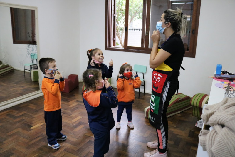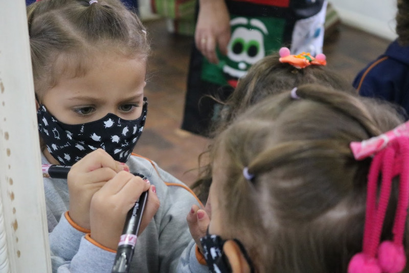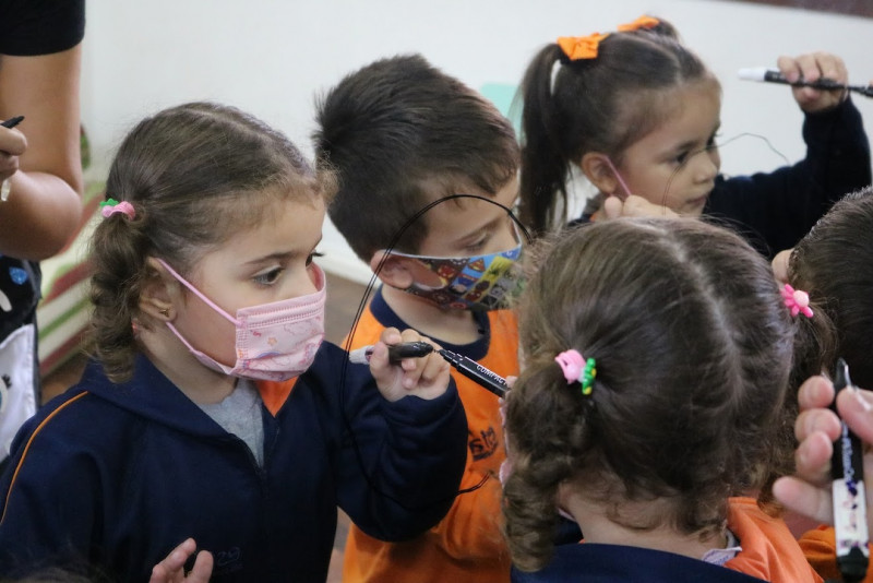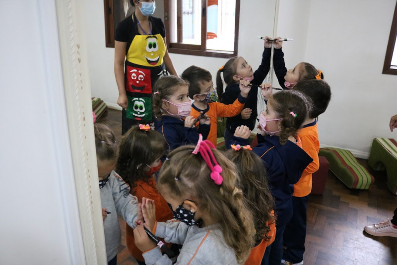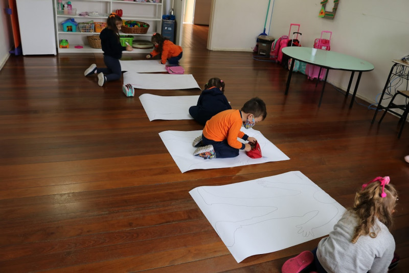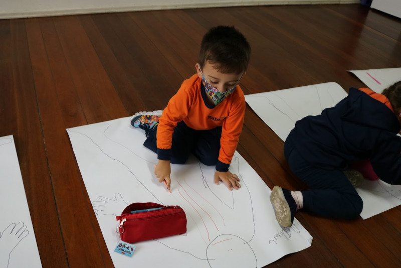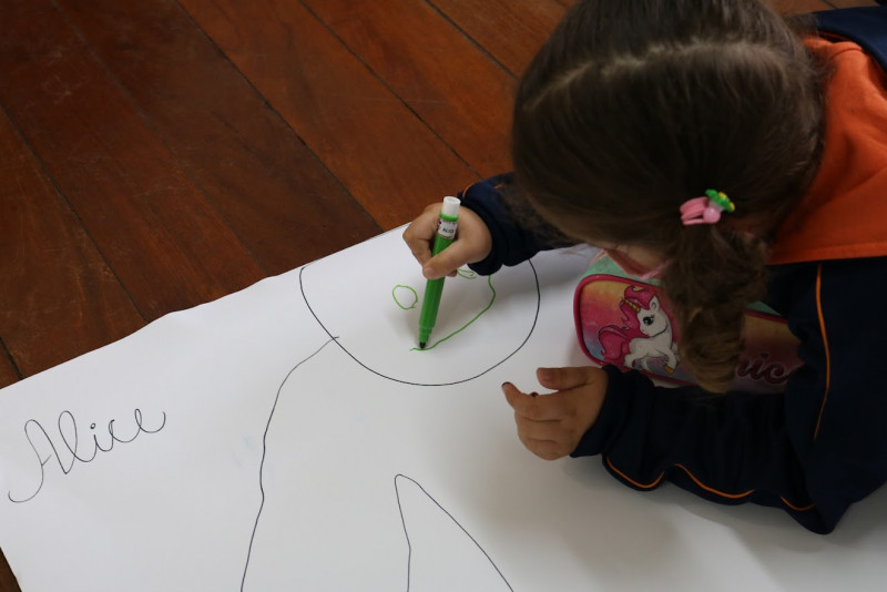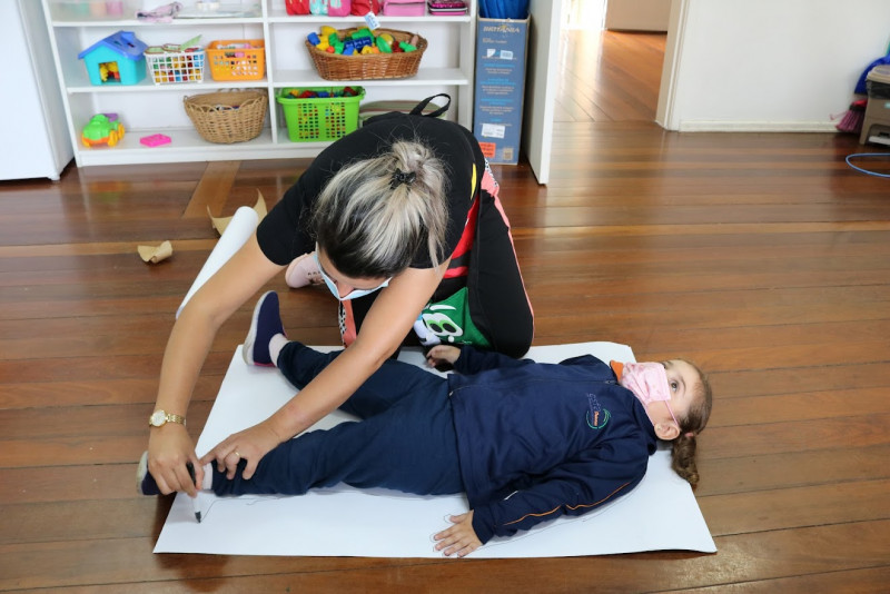 Ontem (04), a turma realizou a atividade do espelho, reconhecendo as partes do corpo e os sentidos, em seguida ouviram e dançaram com a música "Cabeça, ombro, joelho e pé", identificando as partes do corpo através do movimento.A atividade artística com ajuda da professora Gabriele Cavada, foi feita com o corpinho dos estudantes, cada um de formas diferentes. Depois da professora fazer o contorno do corpo dos estudantes no cartaz, eles coloriram e desenharam os sentidos, olhos, boca, nariz, cabelo.