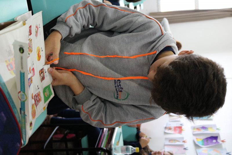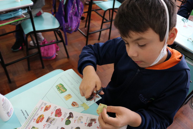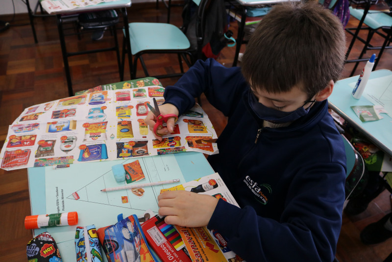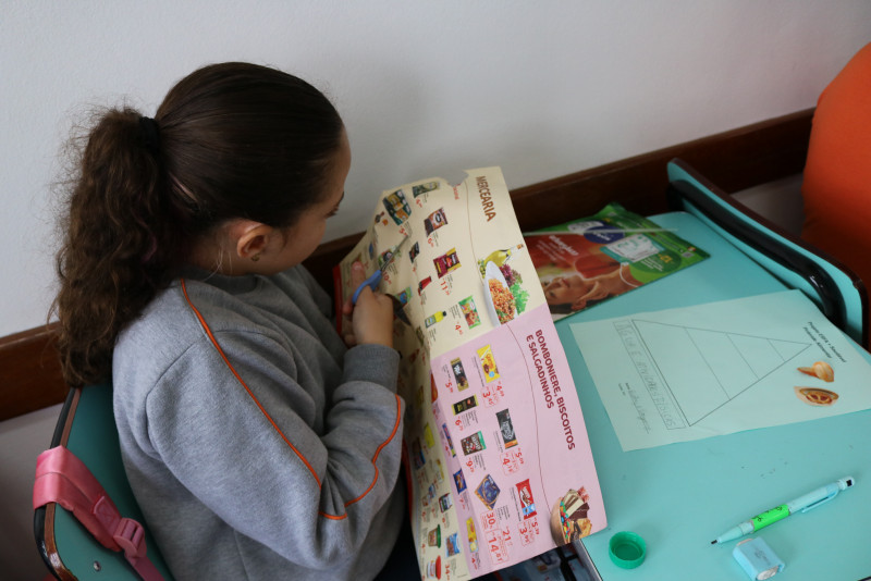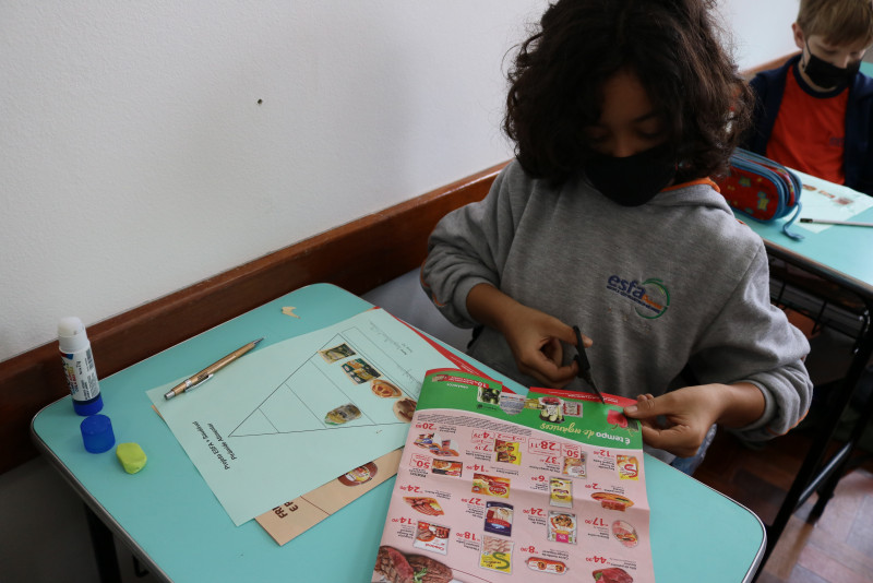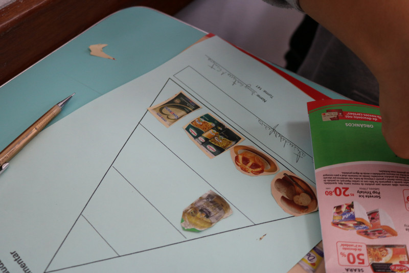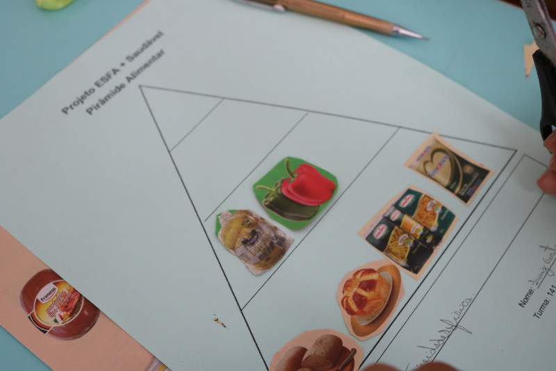 Os estudantes recortaram de encartes os tipos de alimentos que compõe a pirâmide, cada um montando a sua. Com a atividade, foi possível fazer com que eles entendam melhor a funcionalidade da pirâmide alimentar e de cada alimento presente nela.