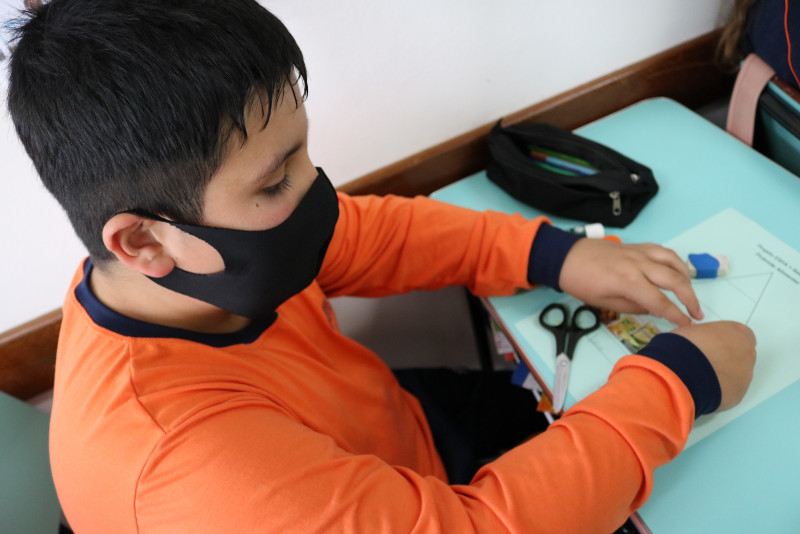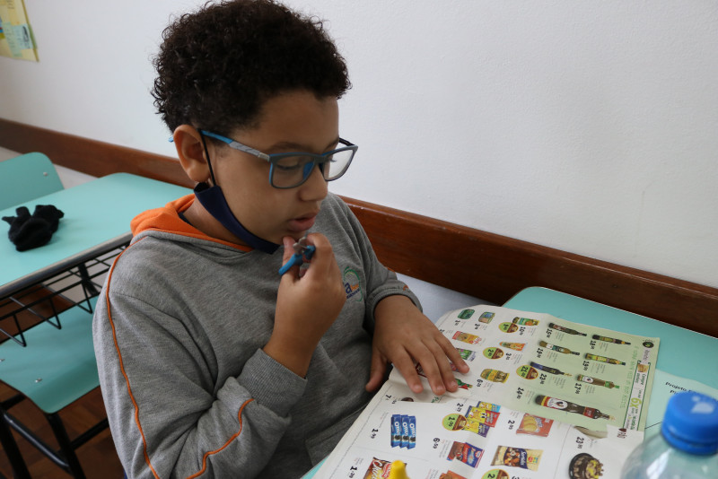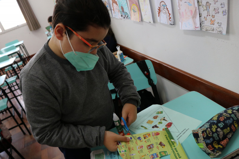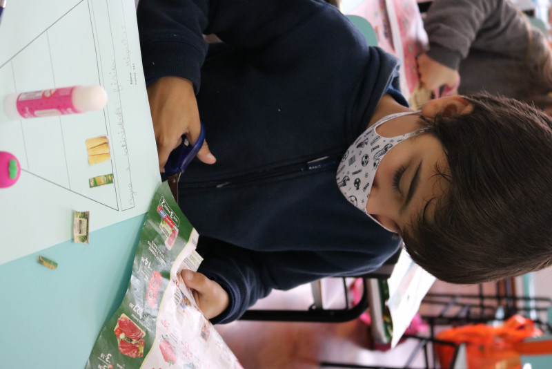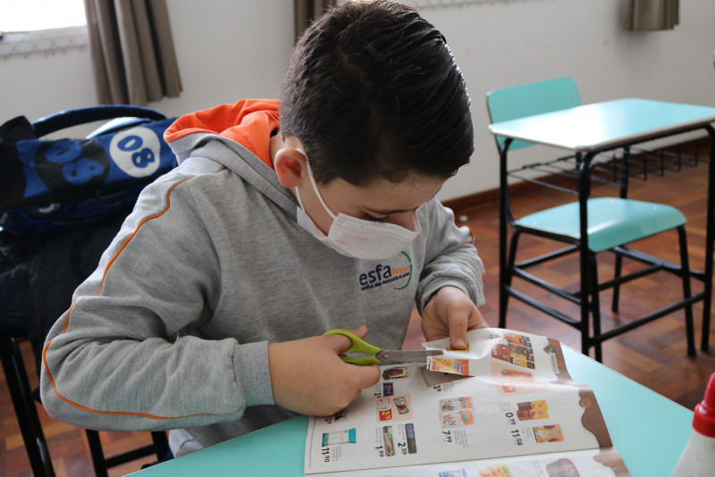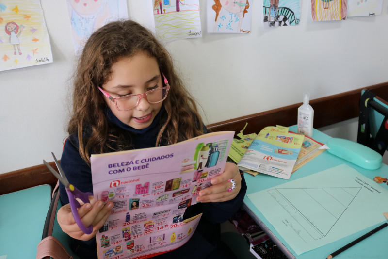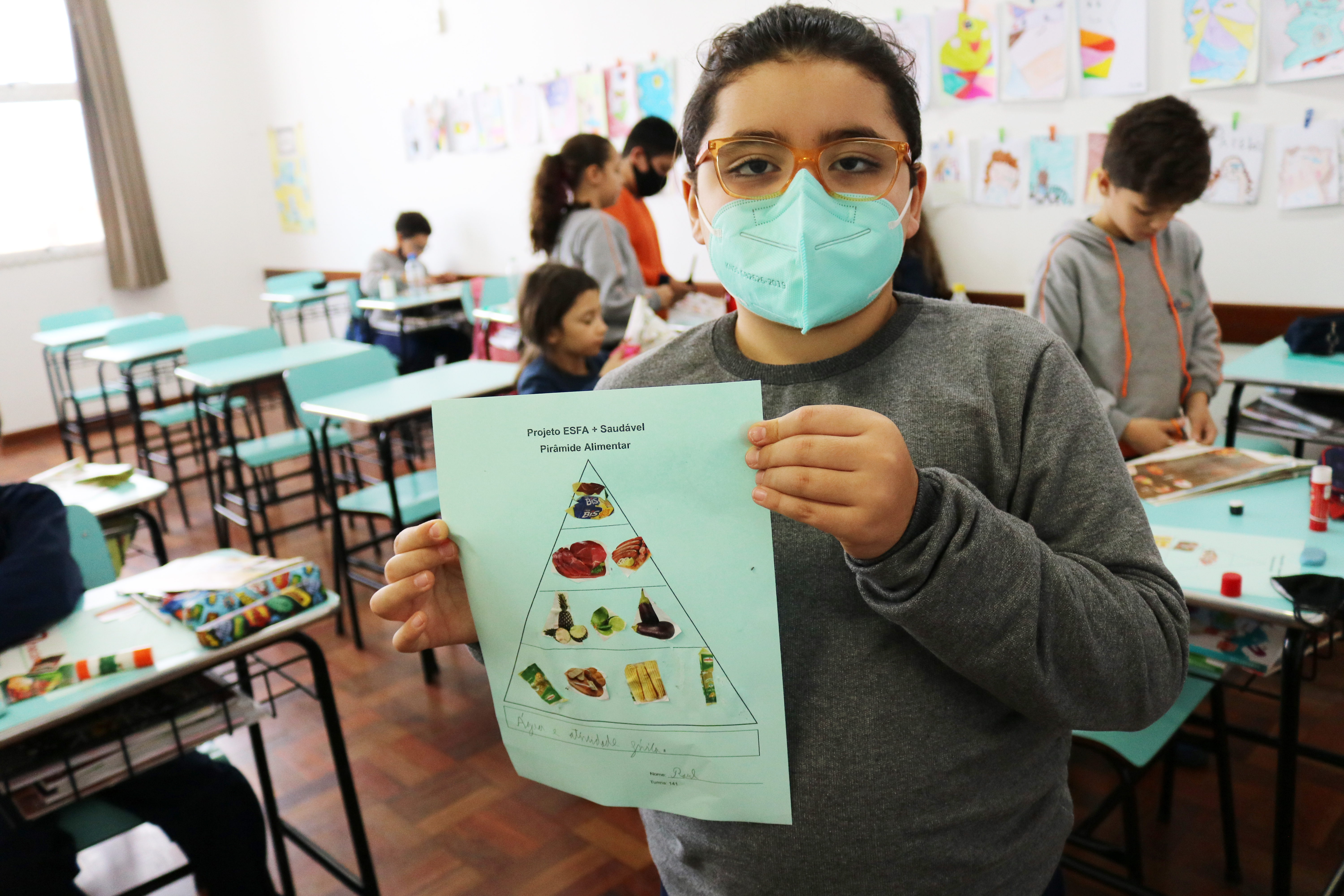 Os estudantes recortaram de encartes os tipos de alimentos que compõe a pirâmide, cada um montando a sua. Com a atividade, foi possível fazer com que eles entendam melhor a funcionalidade da pirâmide alimentar e de cada alimento presente nela.